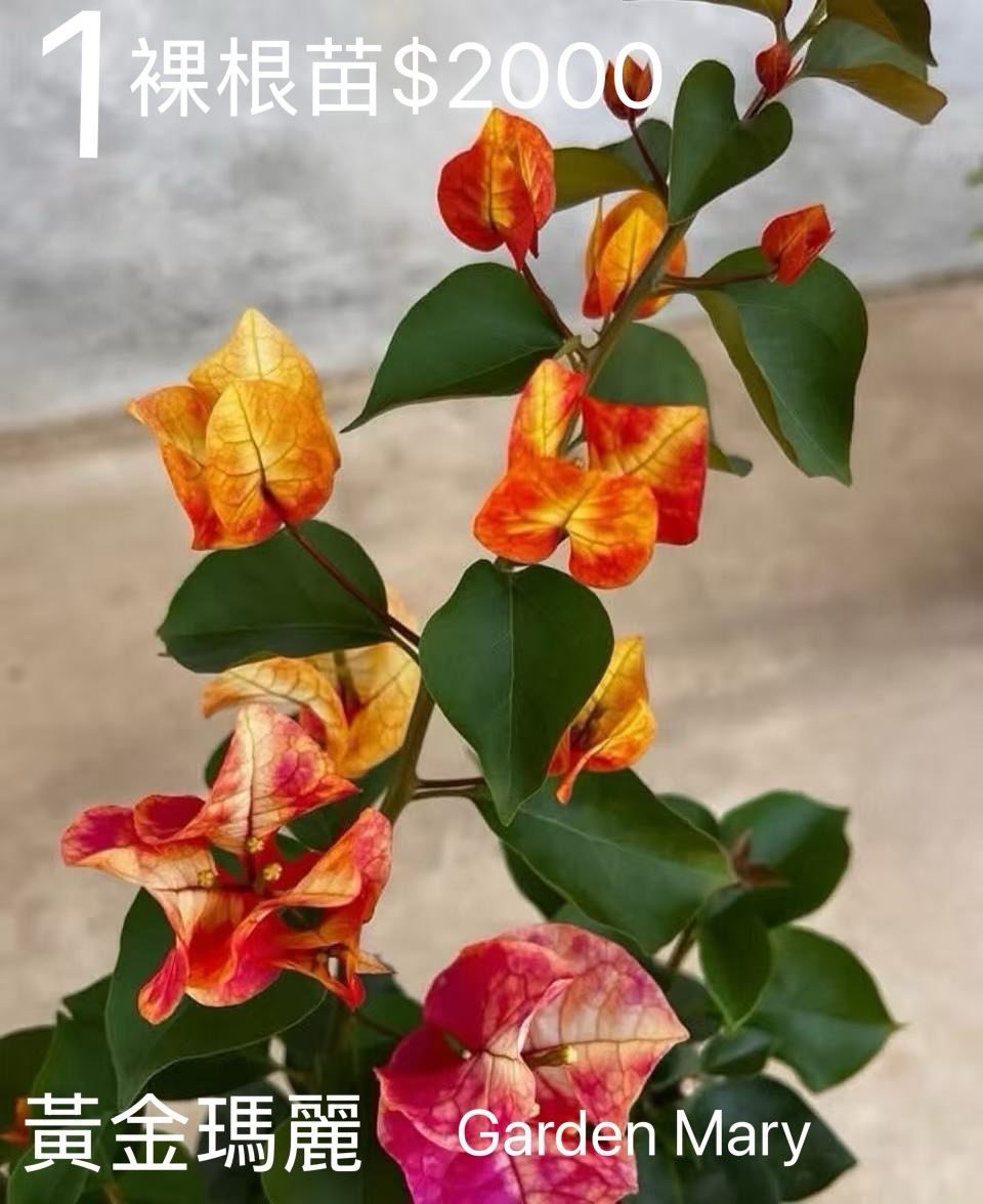令人驚豔的多色苞片,從金黃色漸變為鮮橙色與深洋紅色,宛如將日落美景凝聚於一株植物之中。黃金瑪麗深綠色的光澤葉片與絢麗的花苞形成強烈對比,適合種植於棚架、盆栽或作為庭園主角。稀有珍貴,深受收藏家追捧。